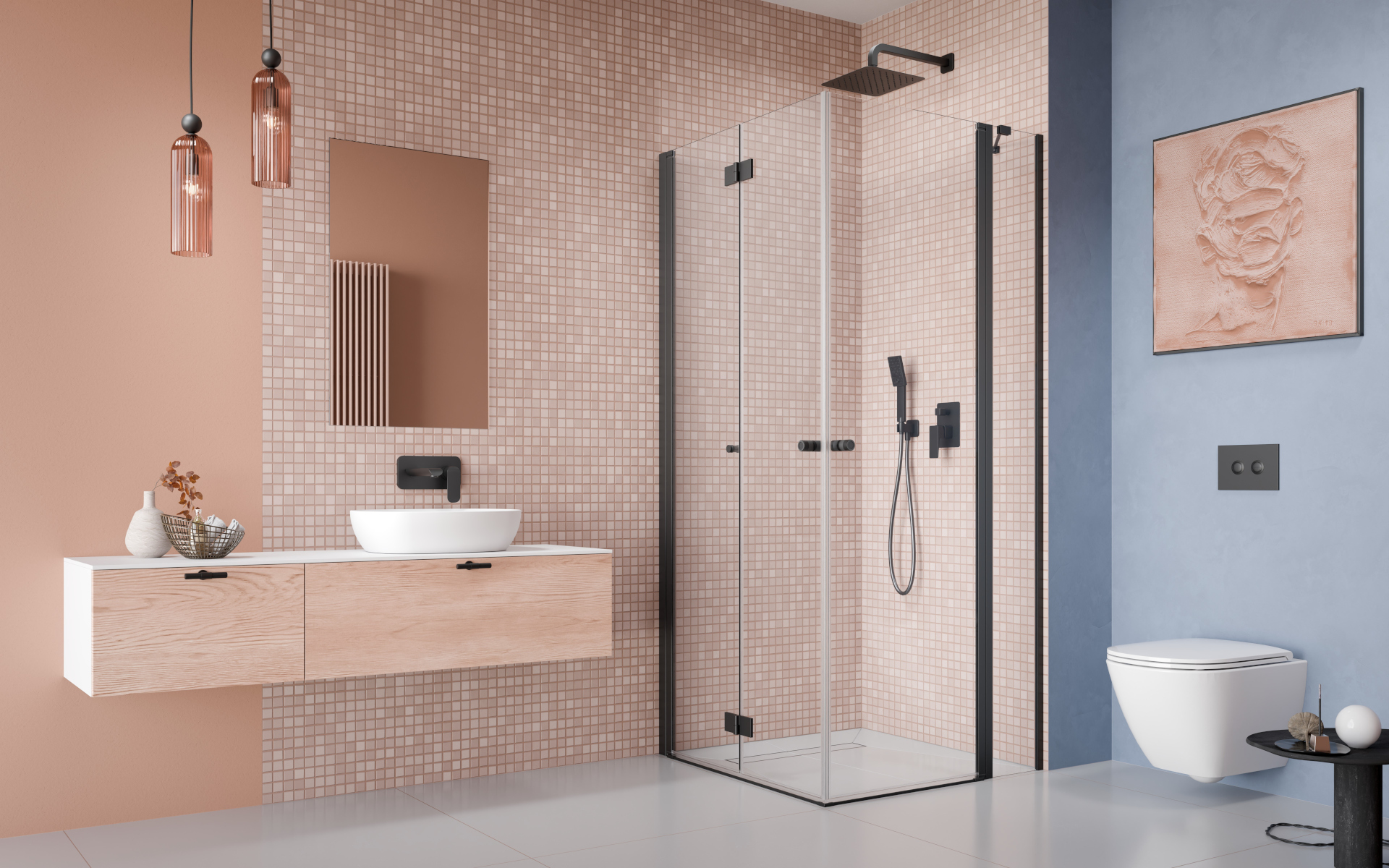 Kabina w takiej wersji wprowadza elegancki efekt wizualny w łazience z betonem architektonicznym, kamieniem naturalnym lub jasnym drewnem (ze szczególnym wskazaniem dębu).